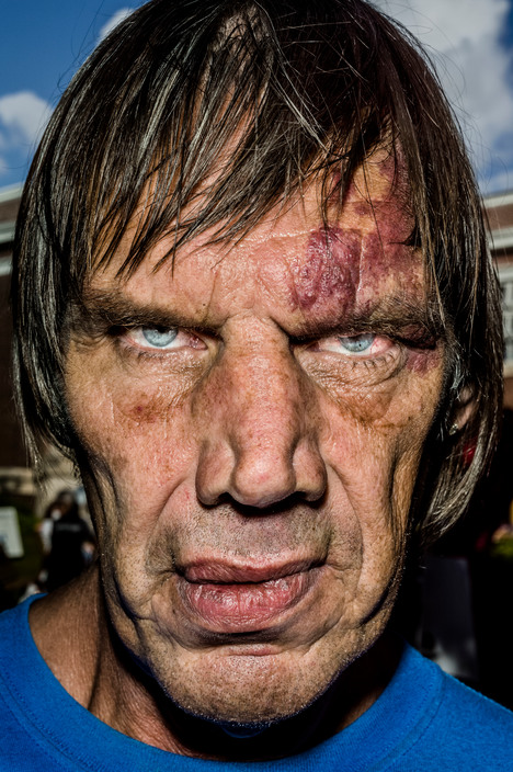 用容易产生畸变的广角镜头,配合后期的高锐度、高饱和、高对比的三高 HDR 风格,来凸显并夸张人物脸部。这些史无前例的丑陋大头照纠枉过正地批判了大众对于美人脸的想象和欣赏。每张脸庞都是并不完全对称,且充斥着各种缺陷的。并且这些人脸又展示出其主人所经历的沧桑和磨难。他们是斗士,与生活抗争并留下荣耀。完全脱离事件要素,任由观赏者去想象和推断。摄影,未必是为了展示狭义的美(其实这里我更愿意用 “漂亮” 这个词),作为街头、纪实摄影师来说尤其如此…… 如果排个不负责任的谱系的话,Bruce Gilden 这部作品里较明显的受 Weege, Lisette