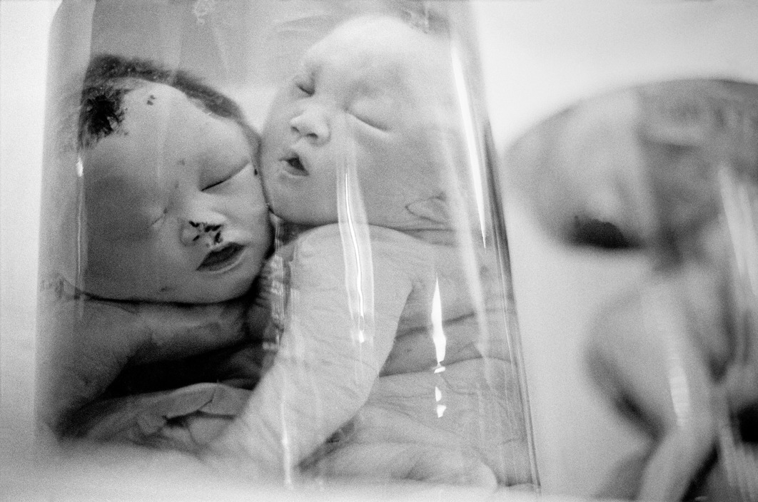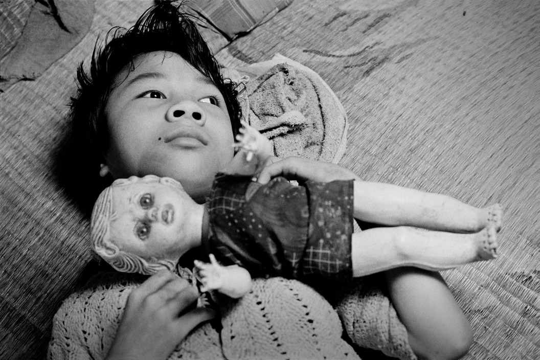 VIETNAM. Le Thi Dat, thirteen, suffers from spina bifida and mental retardation. She is inseparable from her doll. She was born in neary Quang Tri Hospital, “very weak”. Her mother, Le Thi Thuyen, 49, carries her outside most sunny days while she hoes her garden nearby. Her father was a soldier in the Saigon army during the war, stationed near Cam Nghia. 1998.