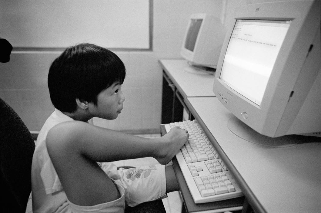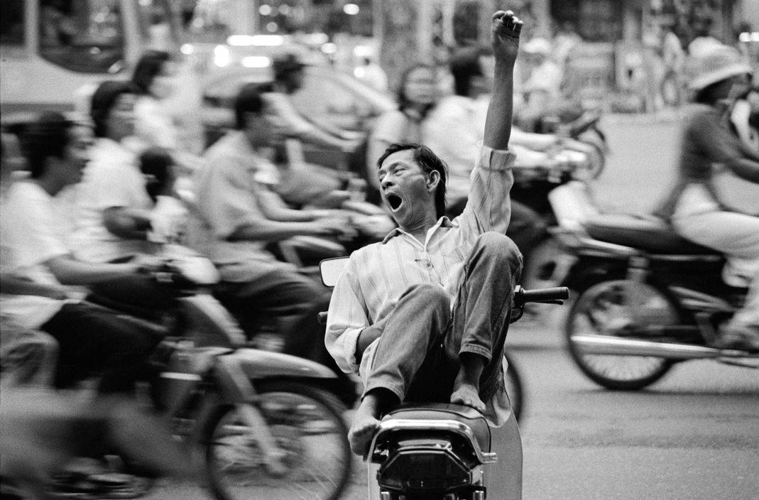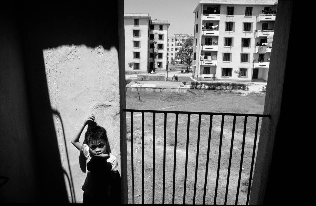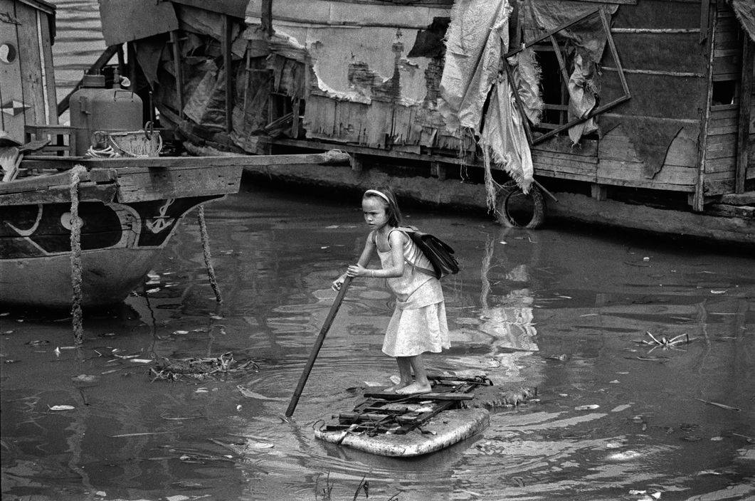 VIETNAM. Ho Chi Minh City. Vietnam at Peace. This girl lives with her family on their boat moored on the Saigon River in Ho Chi Minh City. To get to school, she punts herself to the bank standing on a piece of Styrofoam packing material. 2002.