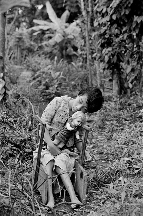 VIETNAM. Le Thi Dat, thirteen, suffers from spina bifida and mental retardation. She is inseparable from her doll. She was born in neary Quang Tri Hospital, “very weak”. Her mother, Le Thi Thuyen, 49, carries her outside most sunny days while she hoes her garden nearby. Her father was a soldier in the Saigon army during the war, stationed near Cam Nghia. 1998.